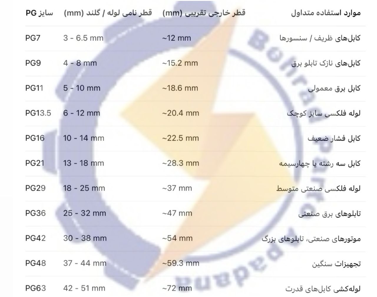 PG11، PG13.5، PG16، PG21، PG29، PG36، PG42، PG48، PG63
